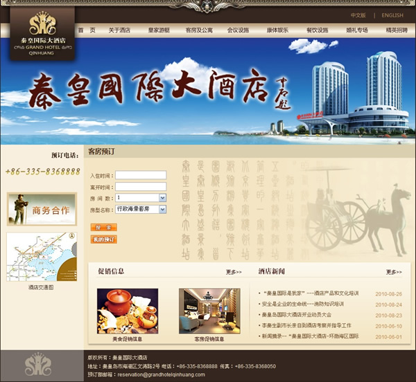 秦皇國(guó)際大酒店是秦皇島盛景集團(tuán)傾力打造,首都旅游集團(tuán)旗下北京貴賓樓飯店管理的一家海濱豪華五星級(jí)涉外酒店。酒店坐擁美麗的西海灘浴場(chǎng),傲臨中國(guó)第一座世界級(jí)海岸長(zhǎng)廊“金夢(mèng)海灣”萬(wàn)米碧浪金灘之上;東鄰國(guó)家足球訓(xùn)練基地;西倚新澳海底世界、海豚表演館等游樂(lè)場(chǎng)所;西北側(cè)即為2008奧運(yùn)會(huì)分賽場(chǎng)奧體中心;南接海濱公園并與渤海云天僅有百米之遙。酒店占地面積為1.7萬(wàn)平方米,建筑面積為9萬(wàn)平方米,總投資約5.8億元。樓宇呈21層雙塔形結(jié)構(gòu),為了觀海,酒店窗戶(hù)進(jìn)行錯(cuò)位設(shè)計(jì)布置。