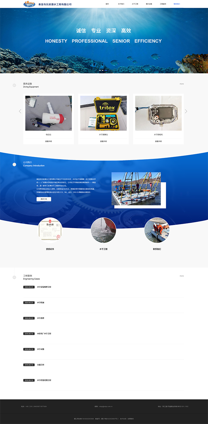 秦皇島兄弟潛水工程有限公司成立于2000年06月,由畢業(yè)于我國唯一的工程潛水學(xué)校——廣州潛水學(xué)校的盧銘臣等共同創(chuàng)立。公司位于環(huán)境優(yōu)美的海濱城市——秦皇島,是一家專門從事水下工程的專業(yè)公司。
